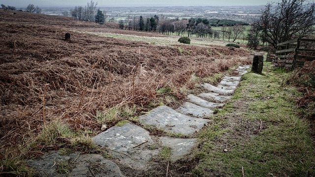 The inspiration to George was an article in I believe ‘The Dalesman’ magazine (always a good read) which stated that an ancient paved footpath had recently been revealed climbing up from Kirkby onto the Cleveland ridge where it crossed the Cleveland Way and headed south. The catalyst for this discovery and the work that followed is due to the efforts of the Kirkby, Great Broughton and Ingleby Greenhow Local History Club. Their work and activities are well documented on their website and the group believe that the path was built by the lay brothers of Rievaulx Abbey.