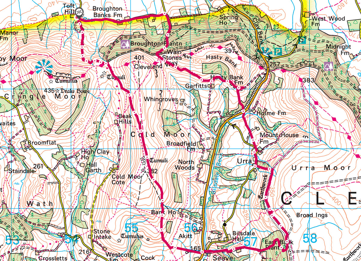 Just after the Three Howes there is a split in the track near a tumuli and the one to the left is taken, heading gradually downhill in a south-east direction, where it picks up the true route at GR 555101. It is now steeper downhill to Cold Moor Lane with a plantation on your left. Ignore the first path on your left and take the second down to Seave Green. Note the superb sloes on the overgrown hedge on your left before arriving in to Bilsdale and the B1257 Stokesley to Helmsley road where there is a welcoming seat at Seave Green.