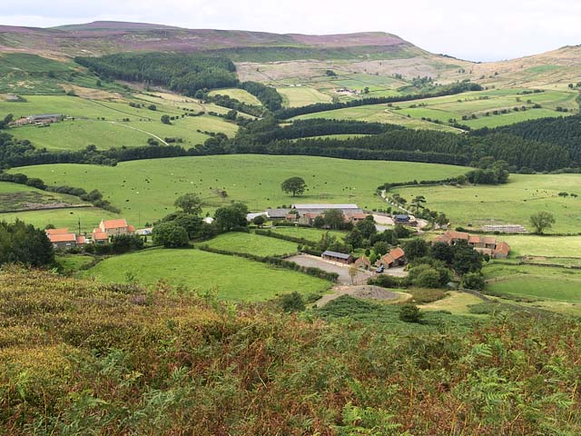 The route is straight across on the access road to East Bank farm (which is a steady climb) and you pass behind the farm to continue up to East Bank Plantation. Continue upwards and nearing the top the gradient is eased by the path cutting across the slope. Near the top where you emerge from the wood are substantial earthworks heading north all the way to Urra Moor. The entry to the bridleway is very wet and tussocky and it is easier to continue upwards a further 100 yards to the broad track on the level ground which is taken north towards Urra Moor. This is a good place for lunch with views down Bilsdale and across to Cold Fell. This track soon comes to a t-junction and you then drop down to the bridleway along the earthworks near Medd Crag. The track to the east goes up to Round Hill on Urra Moor, which is the highest place in the North Yorkshire Moors and is on the Cleveland way which would make a longer walk if you feel fit.