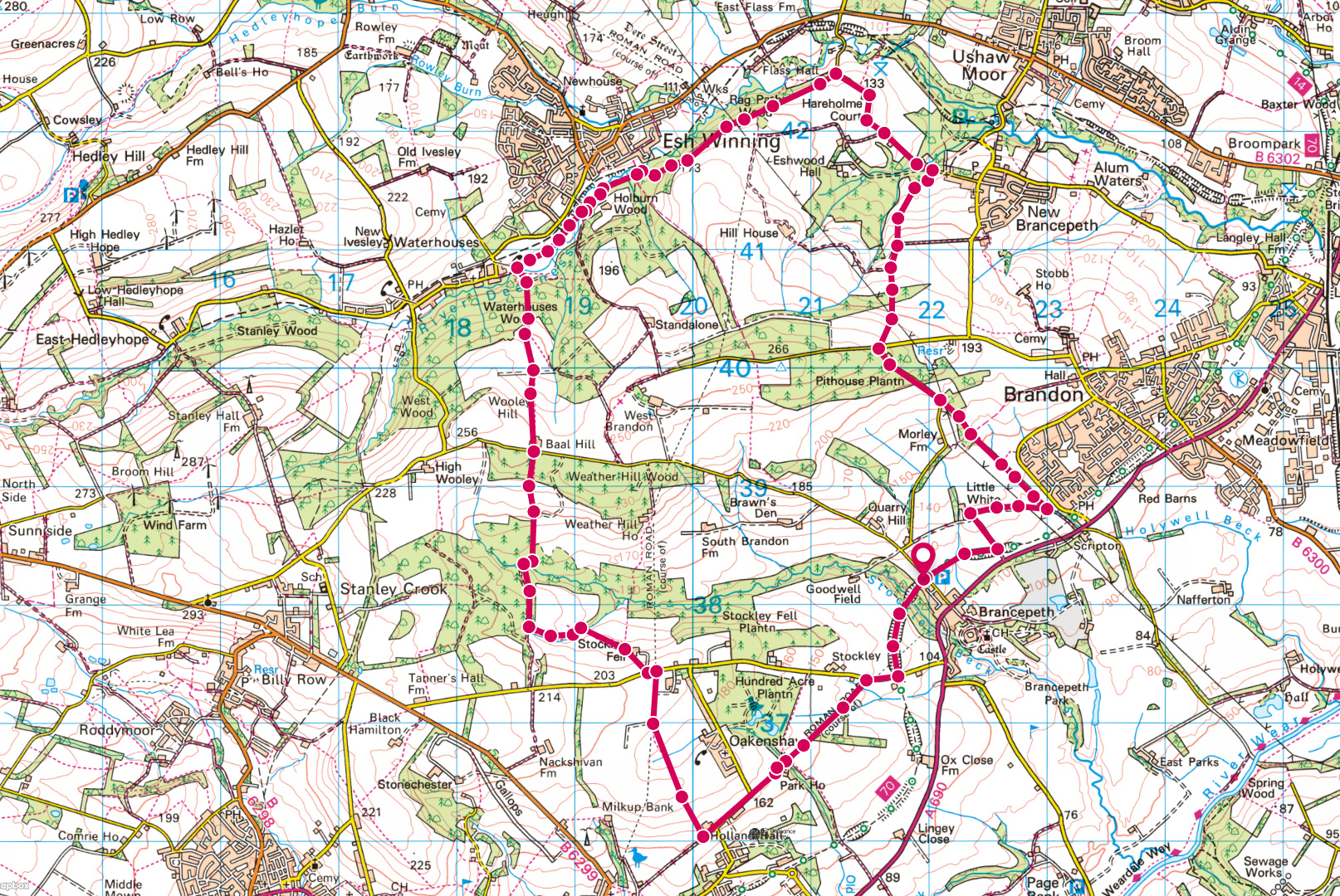Start: Brancepeth Station Car Park on the Brandon to Bishop Auckland Railway line (GR NZ219382)
