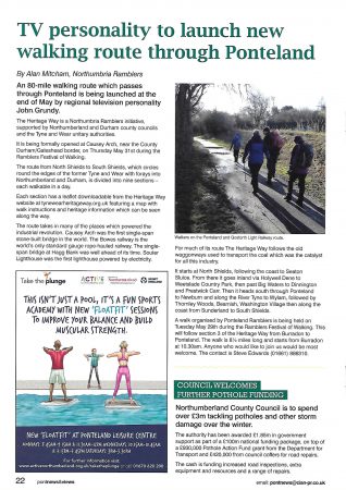 The Heritage Way is a Northumbria Ramblers initiative, supported by Northumberland and Durham County Councils and the five local authorities which constituted the former Tyne and Wear Metropolitan District. It is being formally opened at Causey Arch by TV personality John Grundy on Thursday 31st May during the Ramblers Festival of Walking.