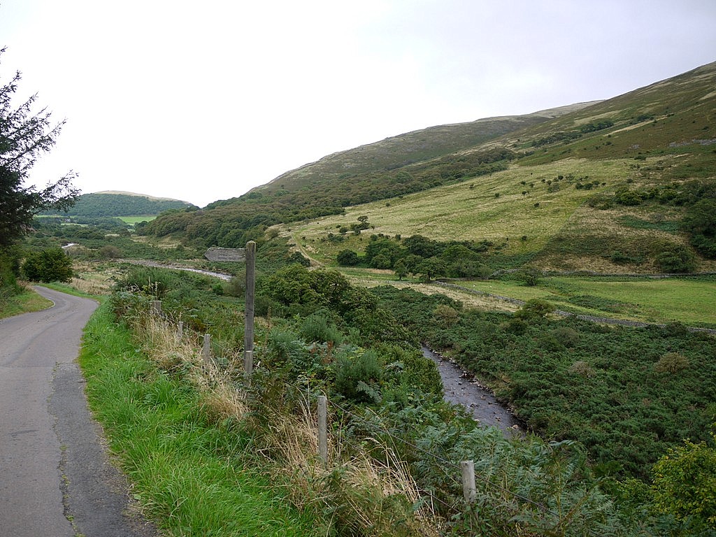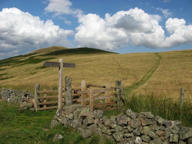 The St Cuthbert’s Way heads west up the access road towards Elsdonburn Farm but before starting have a look down the drive into Hethpool House where several cannons taken from the defences of the Keep in Newcastle can be seen near to the entrance on the right. The path, which is well marked, starts at the bend in the road and it is a steady walk of just over a mile and a half to the farm. Turn left here through the farm passing the bungalow on your right and after two fields descend on your right to cross a ford over Shanks Sike. Ahead is a field behind which is a wood. Cross this field towards the wood aiming for the middle and enter the wood via a stile. There is a path through the wood (not always clear on the ground) and you exit at the corner of the wood. The path is clear now and it is a steady short climb up to the border ridge which is reached just to the south of Eccles Cairn at a gate where there is a “Welcome to Scotland” sign with a similar “Welcome to England” on the other side of the gate.