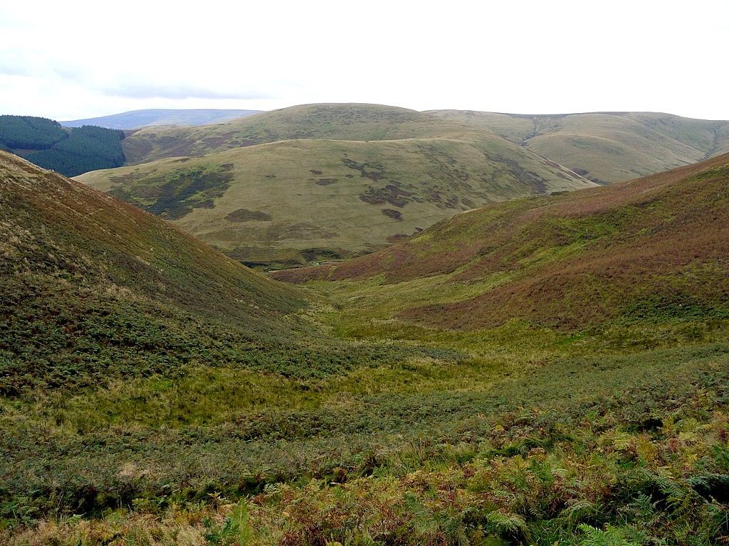 Head south-east on a good track past Maddies Well to Wideopen Head where there are a choice of routes. The main one to the east contours above the Wide Open Burn, on a terrace built years ago and leads directly to Trowhope Farm but a more interesting way is to seek out the little path that descends down towards the Wide Open Burn and then follows the left bank of the burn. On reaching level ground the burn is joined by the Trowup Burn which is crossed to arrive at a broad green track. There are lovely views here back up the Trowhope valley to its source on Black Hag on the Pennine Way and also the Schil a mile further south on the Pennine Way. The path towards Trowhope Farm in the distance looks as though it would go to the farm but instead crosses the Shorthope Burn to enter a conifer plantation. Currently the way through the wood is blocked by fallen trees from the storms of the 2013/ 2014 winter but a way can be found by following the fence on the wood side uphill and then going through a firebreak to arrive at a forestry road, which is followed uphill to the edge of the wood at a site of a former homestead. The stile on the right of way can be seen about 100 yards down the fence.