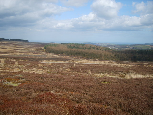 When I first visited here in the 1970s many walkers, myself included, took a shortcut over the ironstone slag and alum shale tip to arrive directly to Slapewath but in retrospect this was a poor decision as it omitted the woodland walk to Charltons. In mitigation this was not then an attractive area as the slag bank over which the route passed was being processed for roadstone which was the business I was employed in. The two earlier books on the Cleveland Way are “The Official Guide” by Alan Falconer (1972) whose father is generally credited with the idea of the Cleveland Way and Bill Cowley’s 1975 Dalesman book. Both writers knew this area intimately and both comment on route-finding in this vicinity. No such problems now as you continue past Slapewath and pick up the concrete road heading steeply upwards towards Round Close Farm with Spa Wood on your left. This area is a mountain bike activity area and looks very strenuous. On reaching the end of the wood turn right over the stile to enter open moorland and follow the Cleveland Way westwards climbing gradually upwards. The views here, following the felling of many trees, are excellent – looking north up the Durham coast much of which is in the hands of the National Trust and east out to sea. Currently the path leaves the hard track for a distance to avoid forestry work and this gives your feet a rest from the hard surface. After a distance of about a mile and a half at GR 624144 we leave the Cleveland Way and head south. This is on a landrover track which soon turns right but our way is straight ahead south to the visible stile leading on to the open moor.